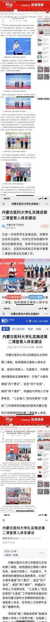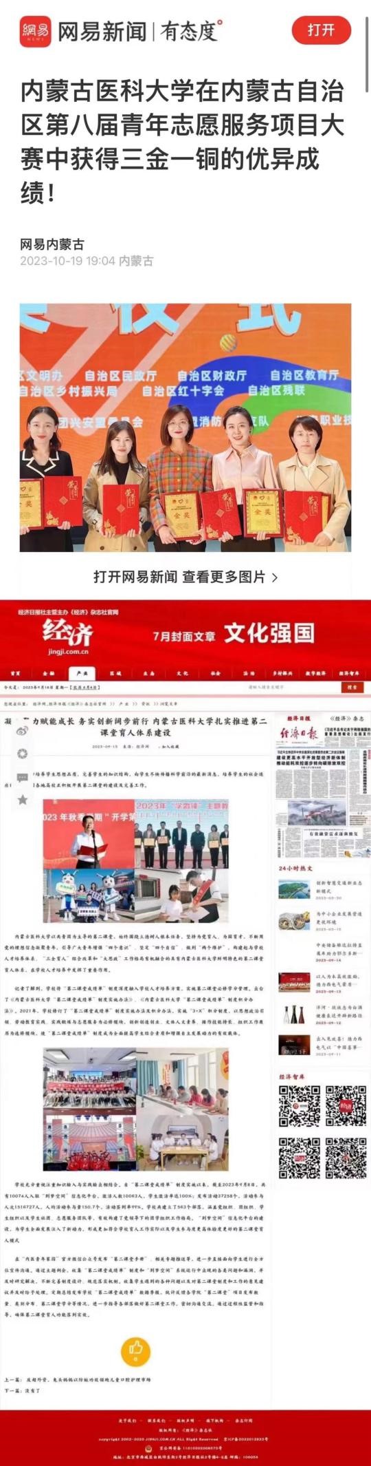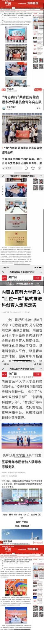 2023年,内蒙古医科大学共青团科创育人、第二课堂育人、青年突击队、实践育人、理论宣讲、志愿服务等工作取得的成效得到央广网、经济网、网易、新华网、团中央融媒体团建头条、今日头条、奔腾融媒等多家中央级媒体和自治区主流媒体的报道。
